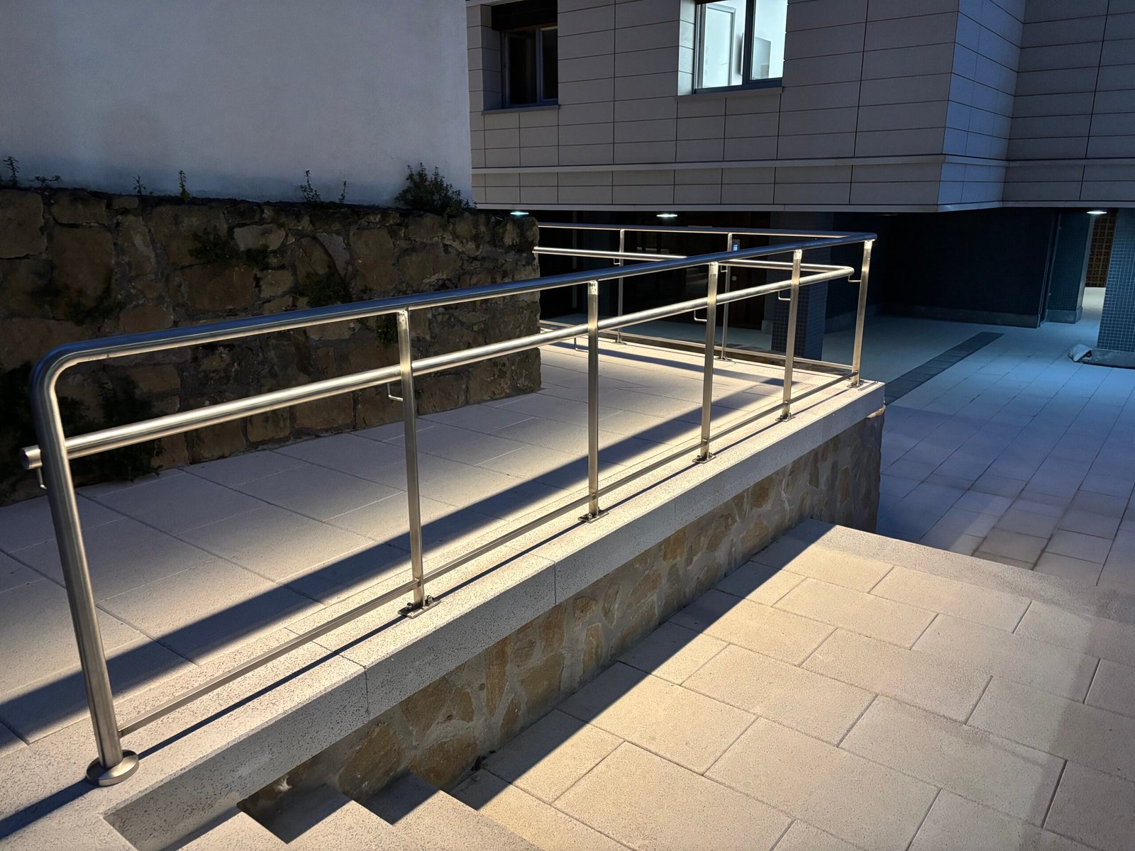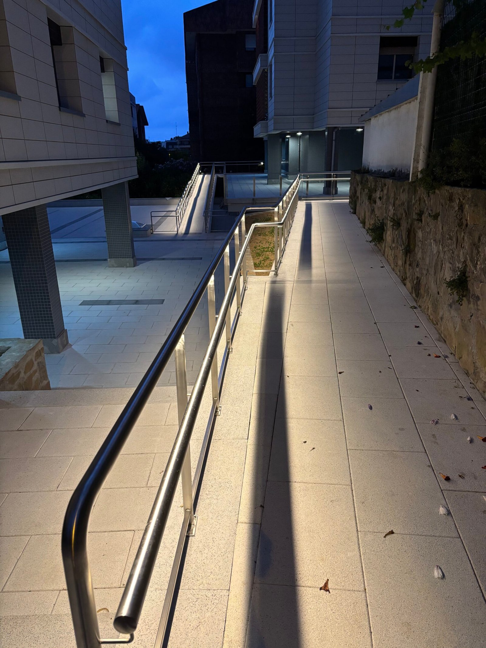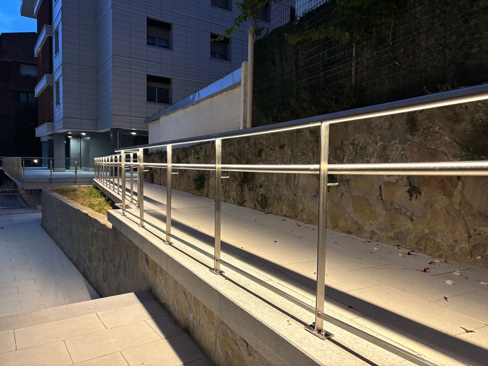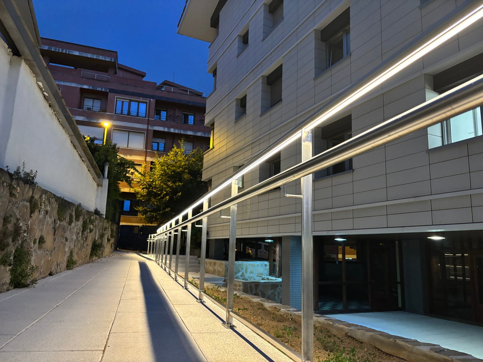 Iluminación exterior bajo barandilla de acero inoxidable en patio comunitario de Getxo
