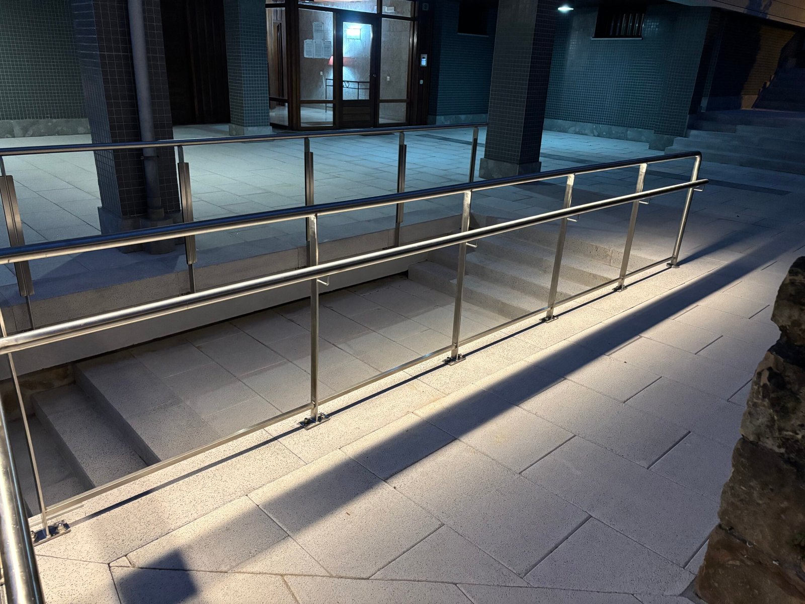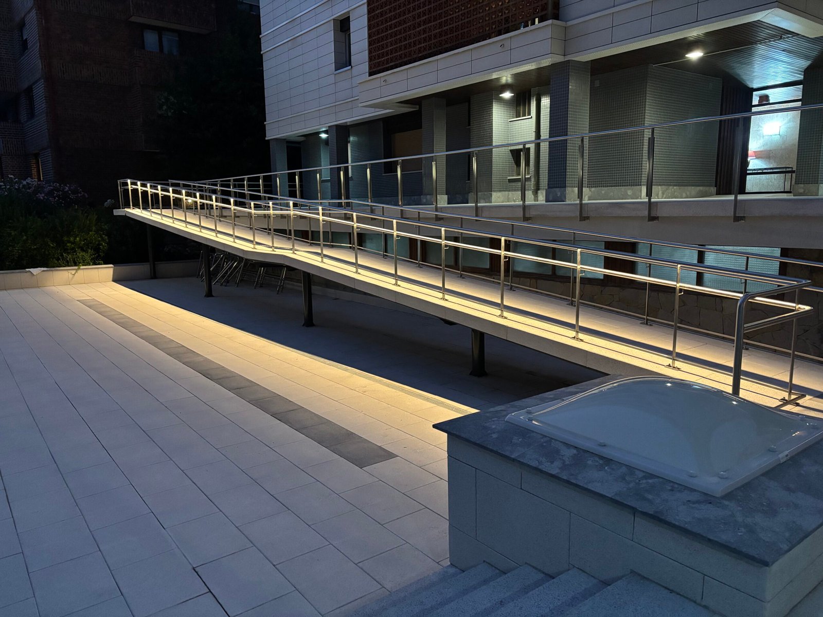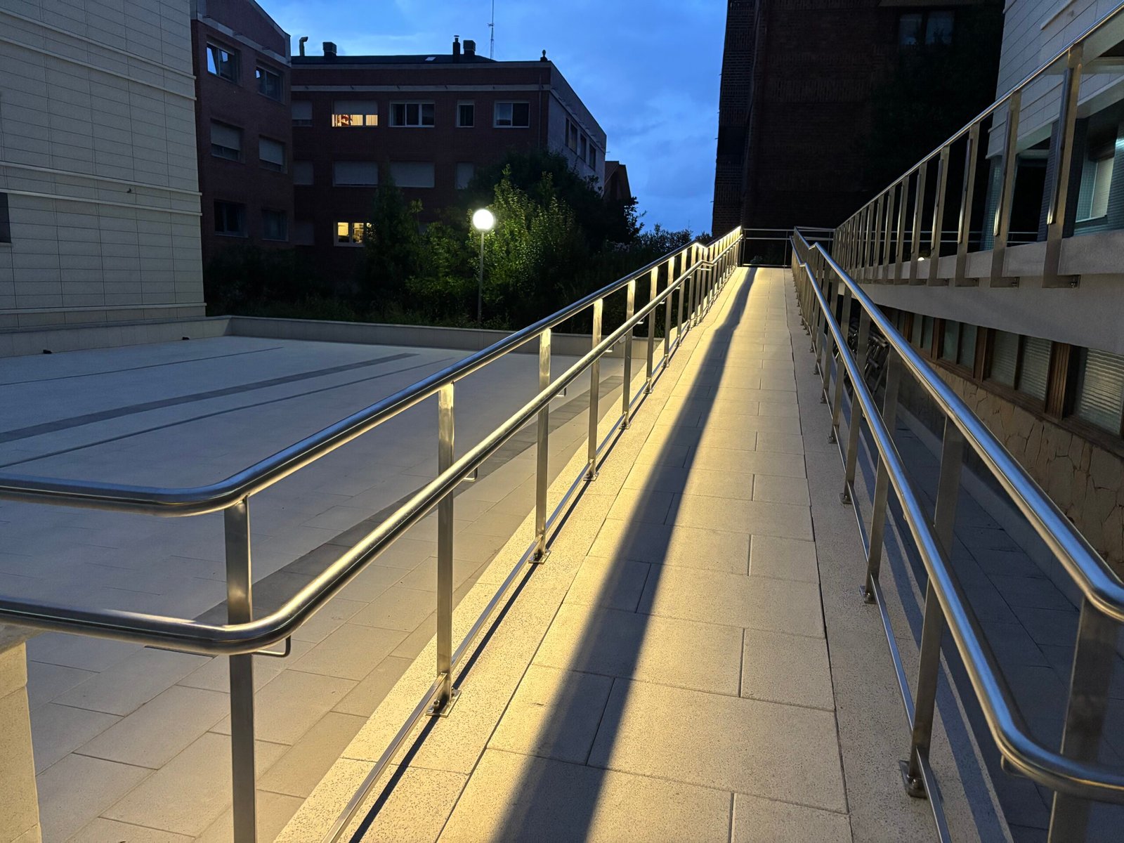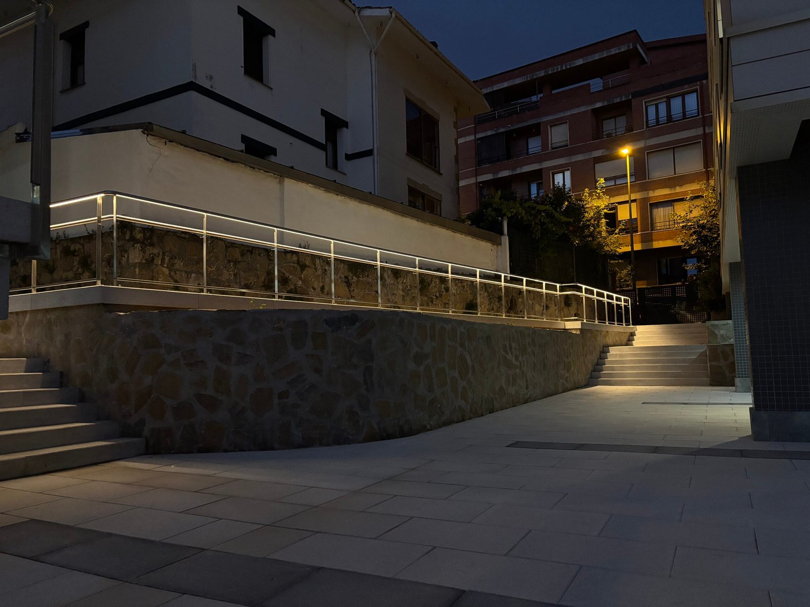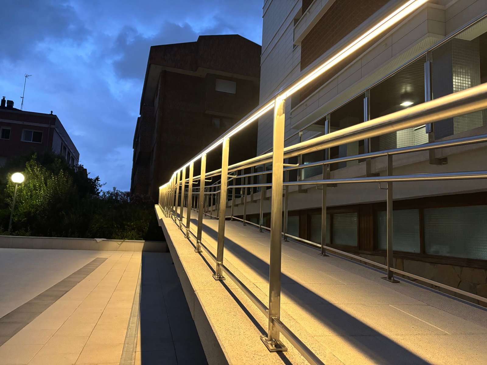 Iluminación exterior bajo barandilla de acero inoxidable en patio comunitario de Getxo